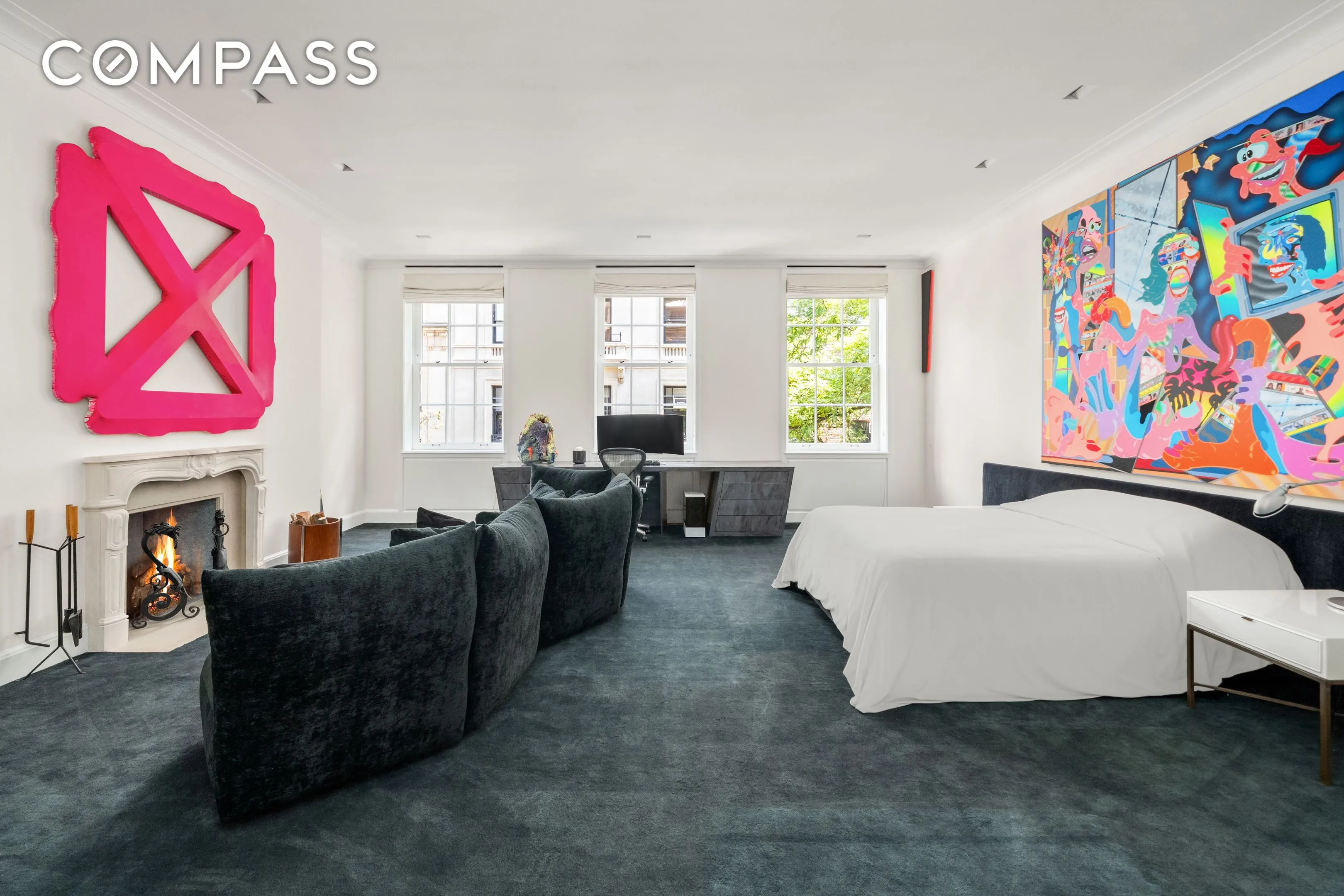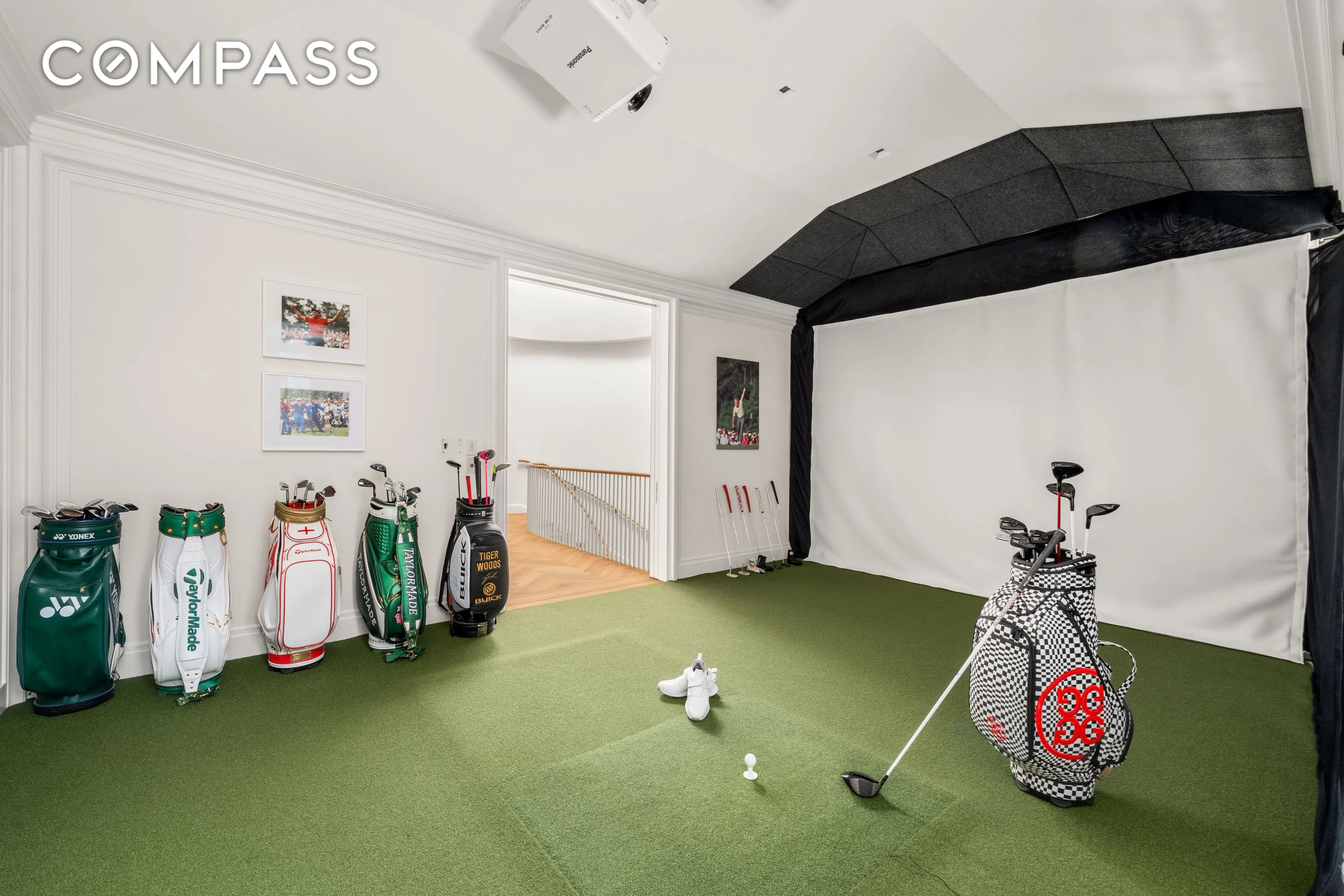 The parlor level features expansive living and dining rooms with soaring ceilings, fireplaces, and refined proportions. The full-floor primary suite includes a fireplace, dressing room, spa-quality bath, and an adjacent library or sitting room. Two upper floors provide multiple bedrooms with en-suite baths, along with a flexible living space currently used as a grand billiards and entertaining space. The top level is designed for recreation and entertaining, featuring a golf simulator, an adjacent kitchenette, and direct access to a private sun deck. The lower level is fully built out for wellness and service, featuring a large private gym, steam room, sauna, and an expansive laundry and service area. Multiple outdoor spaces extend the living experience, including the garden and elevated terraces.
