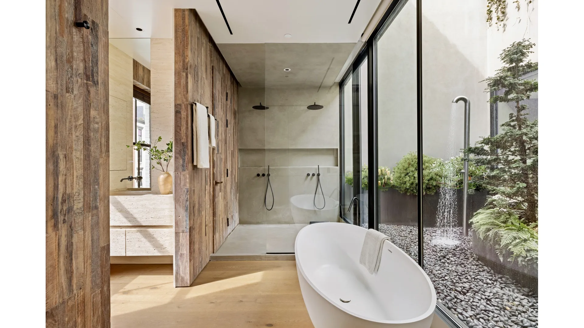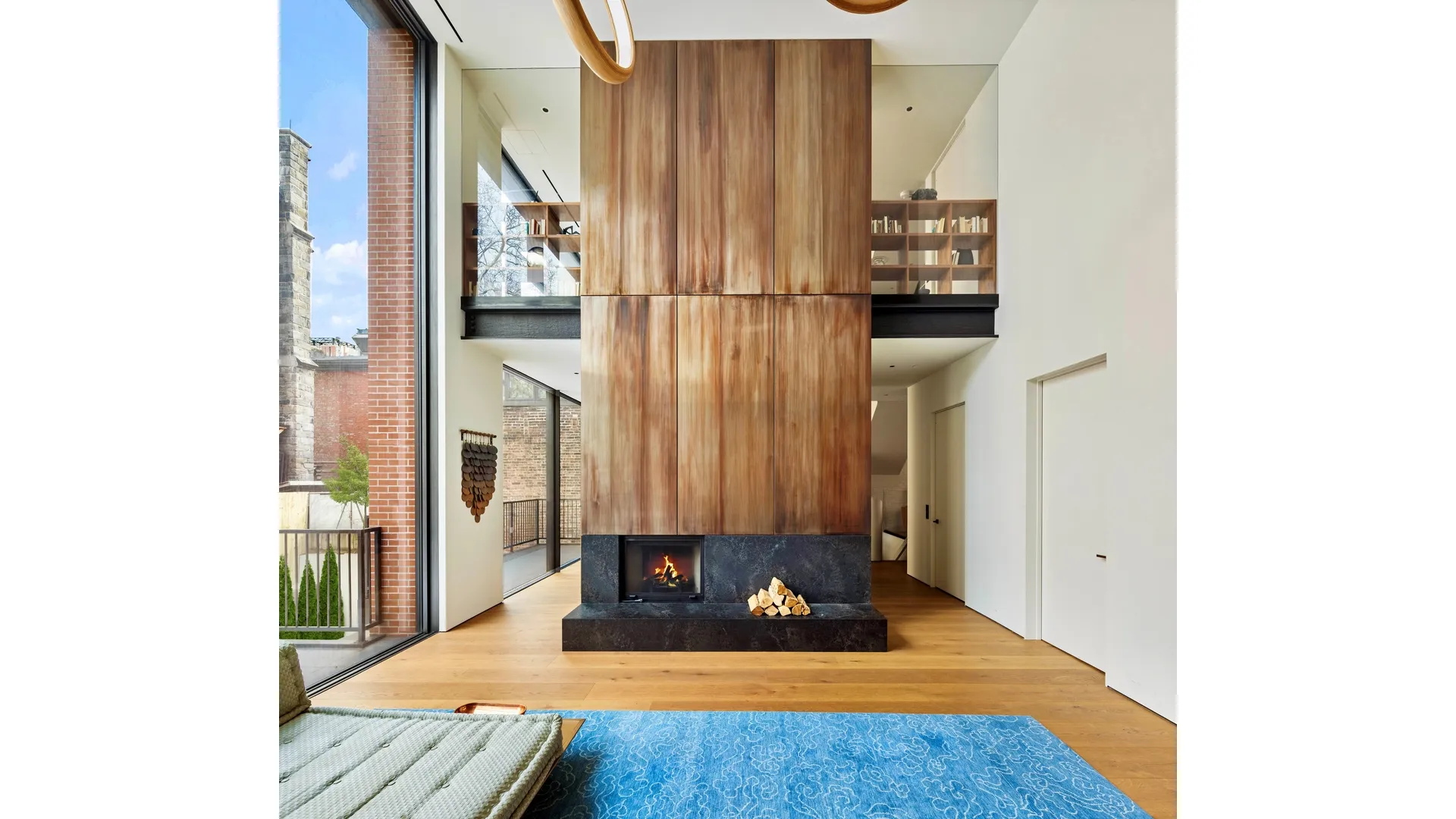 More than twice the width of most townhouse homes, 345 West 19th confidently delivers dramatic loft-like scale on all levels. The stunning great-room, crowned by 20-foot ceilings and anchored by a wood-burning fireplace in blackened steel, opens through full-height retractable glass walls onto terraces overlooking a private garden-creating seamless indoor-outdoor living. Oversized windows bathe the interiors with natural light, framing leafy south-facing views in front and the striking facade of a nearly 200-year-old stone church to the rear, ensuring privacy and tranquility. The primary suite is a true sanctuary, featuring a grand bedroom and spa-quality bath connected by a luminous, glass-enclosed atrium with a sunlit outdoor shower-an architectural rarity in New York City.