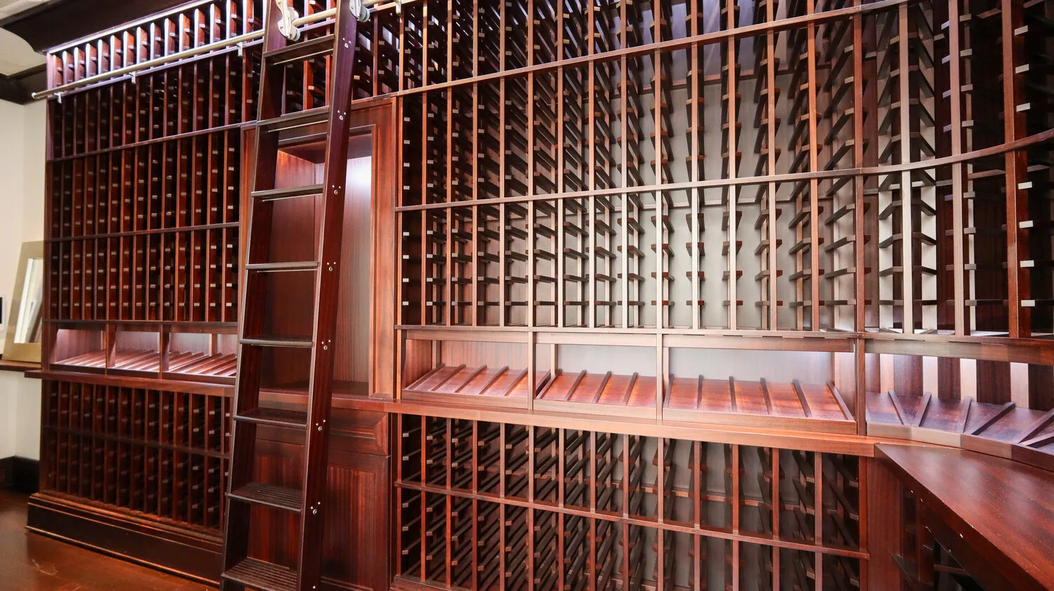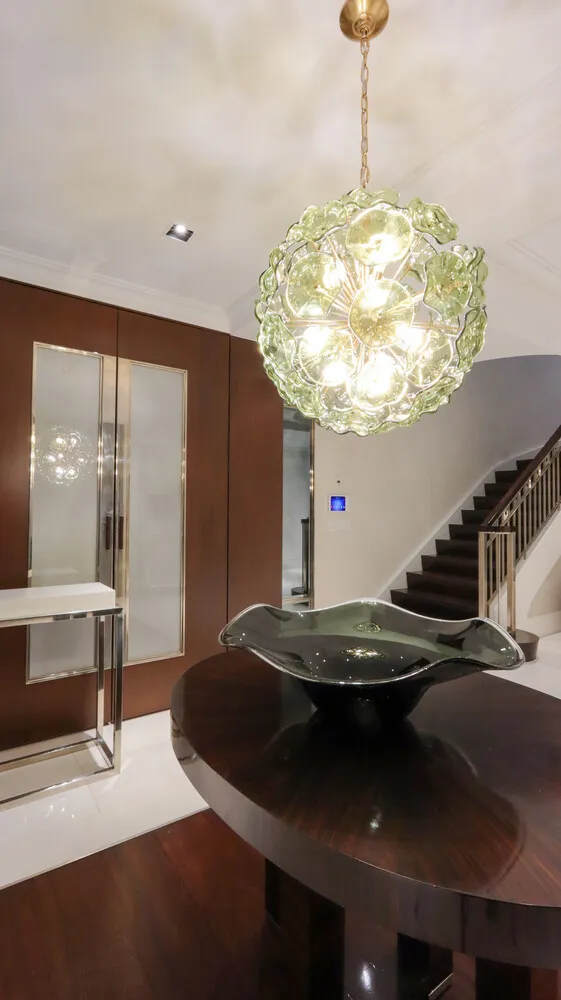A sculptural staircase or private elevator leads to the second floor, where formal entertaining spaces unfold beneath soaring 11+ foot ceilings. The dining room features herringbone hardwood floors, a gas fireplace, wet bar, and an impressive wine lounge with capacity for over 1,000 bottles. The adjoining living room is equally refined, offering oversized windows, a wood-burning fireplace framed in white onyx and mahogany, radiant heat floors, and a powder room.