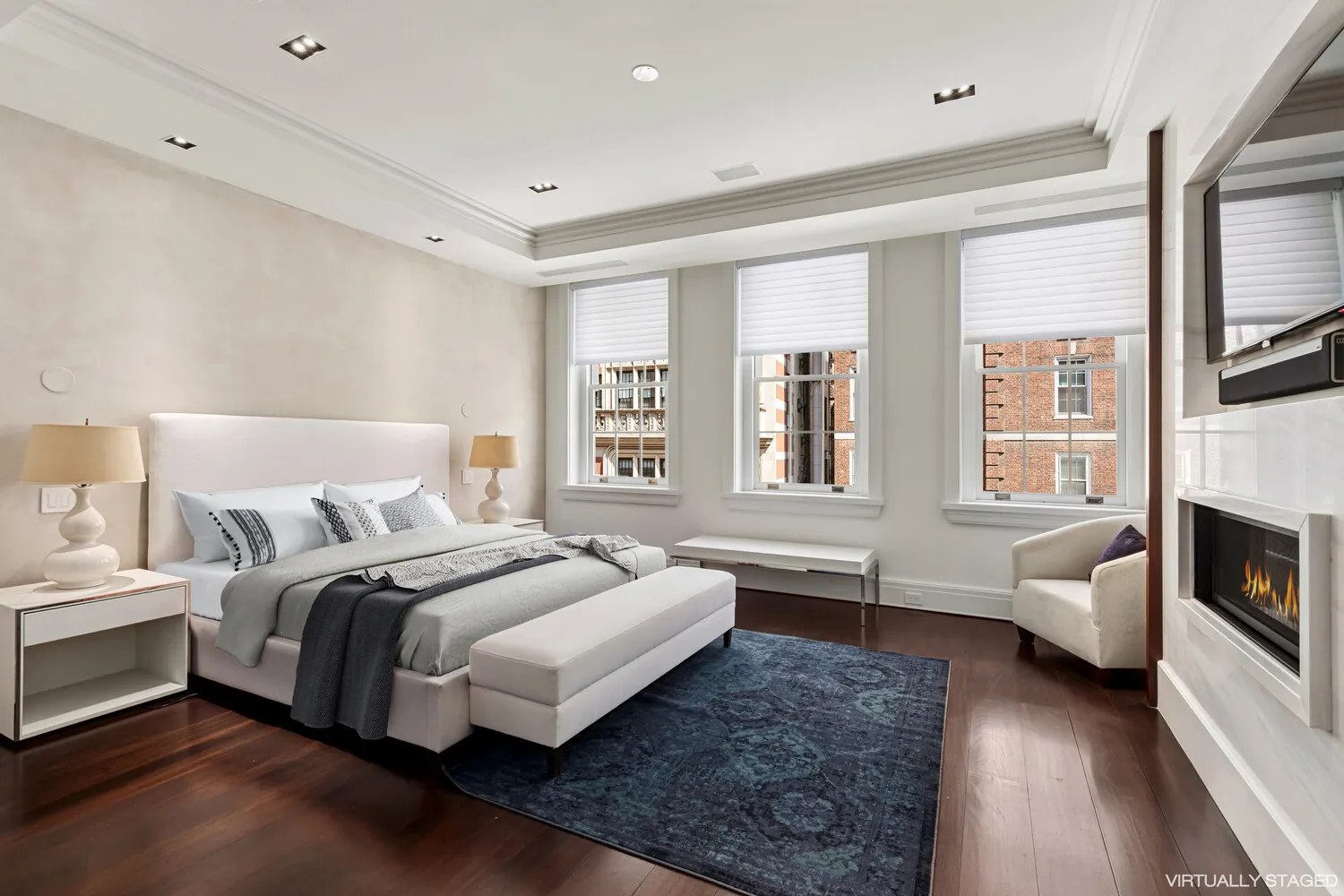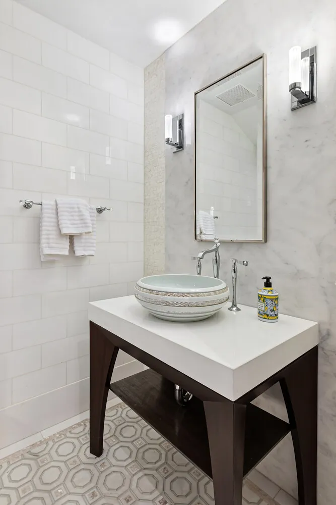 The entire third level is dedicated to a luxurious primary suite. With 11-foot ceilings, a gas fireplace, and a private terrace, the bedroom is both grand and intimate. The spa-like primary bathroom showcases Thassos marble, radiant heated floors, a steam shower, soaking tub, and premium fixtures by Fantini and THG. A custom dressing room with floor-to-ceiling millwork and an additional sitting area-ideal as an office or expanded closet-complete this level.