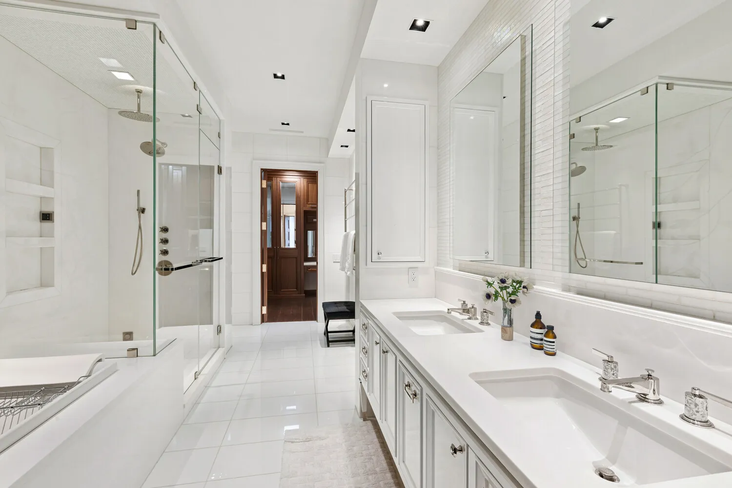 The classic red-brick facade, accented by a limestone cartouche and set behind a private gate, introduces a residence of timeless elegance. Inside, a gracious foyer opens to an expansive first floor with radiant heated floors throughout. The layout flows into a custom chef’s kitchen, appointed with Glassos countertops, a Calacatta Nuvolato marble backsplash, and a full suite of top-tier appliances including double refrigerator Sub-Zero, Wolf, and Miele, along with a built-in Nespresso system. A sun-filled breakfast room overlooks the private rear garden.