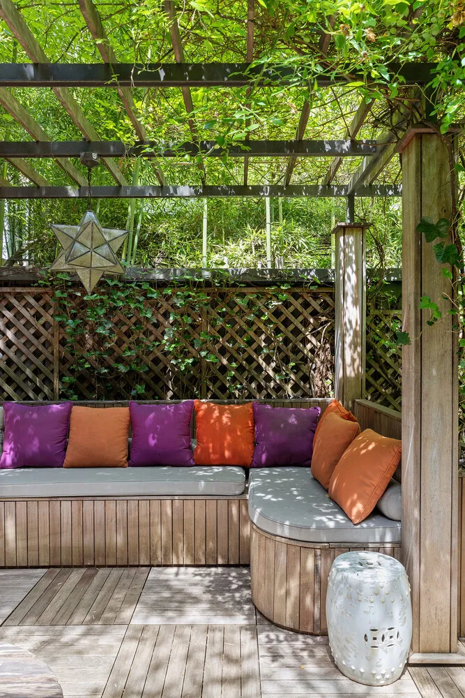 A gated entry and regal Italianate facade conceal spacious, sun-splashed interiors with three exposures (north, east, and south) and preserved original details like archways, hand-carved fireplace mantels, soaring ceilings, stained glass accents, and a dramatic winding staircase crowned with a skylight. In the garden, alfresco meals and intimate gatherings are set against a backdrop of lush greenery, flowering trees, and a choir of chirping birds.