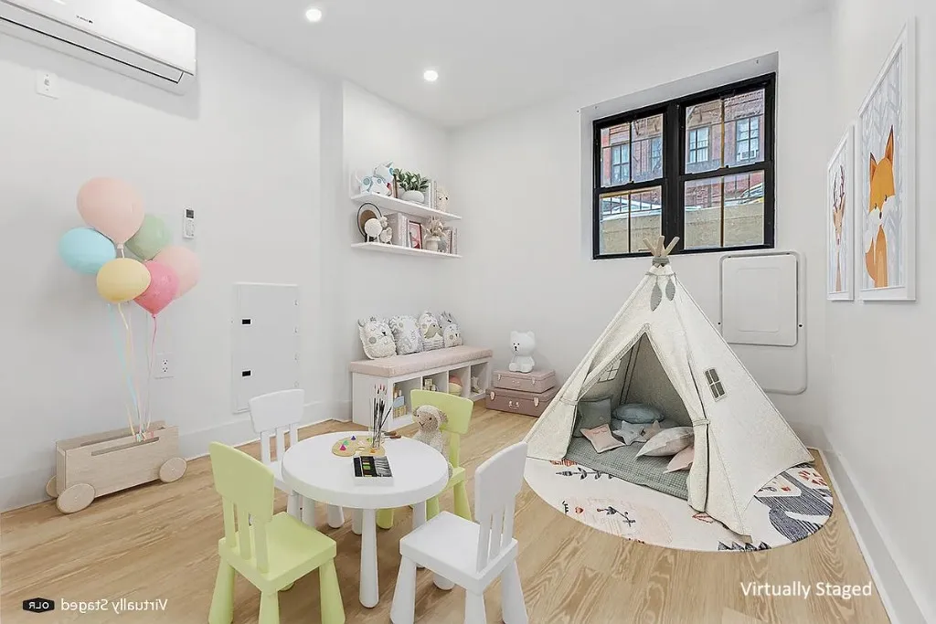 – Cellar Level: Discover a truly unique bonus space! This fully renovated, high-ceilinged cellar offers incredible versatility: two home offices/studios/recreation rooms/kid’s playroom/ or your walk-in closets, (one of the two with a window) and a powder room. Imagine the possibilities!