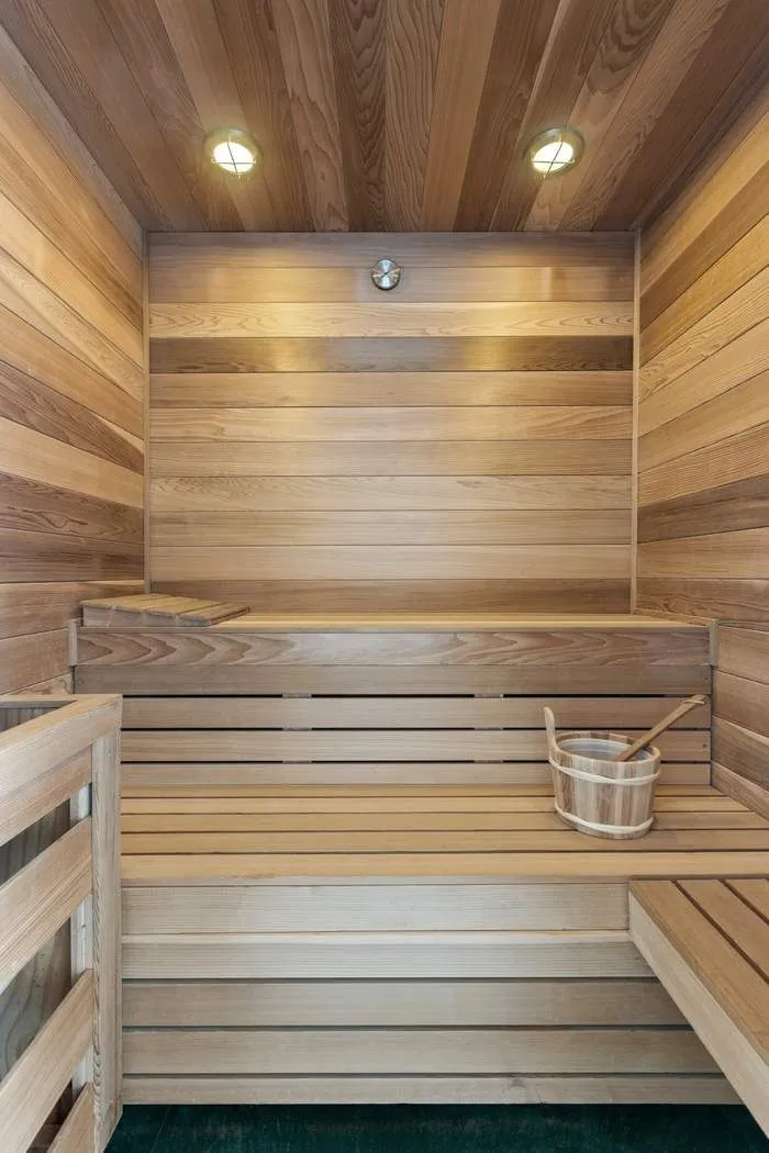 Upstairs, an open office and lounge overlook the great room adjacent to a sitting area with wet bar. To the north, a cozy terrace invites morning coffee or sunset views. To the south, a gym adjoins the primary suite, a private retreat wrapped in three exposures. The primary bath evokes a spa with a Boffi soaking tub, dual steam shower, sauna, and Poliform closets, opening to a tranquil bamboo garden.