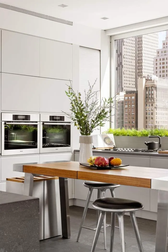 The chef’s kitchen blends form and function with basalt and quartz surfaces, Henrybuilt cabinetry, a Bulthaup island, and professional-grade appliances by Sub-Zero, Gaggenau, and Miele. A living green wall introduces an organic contrast to the architectural lines.