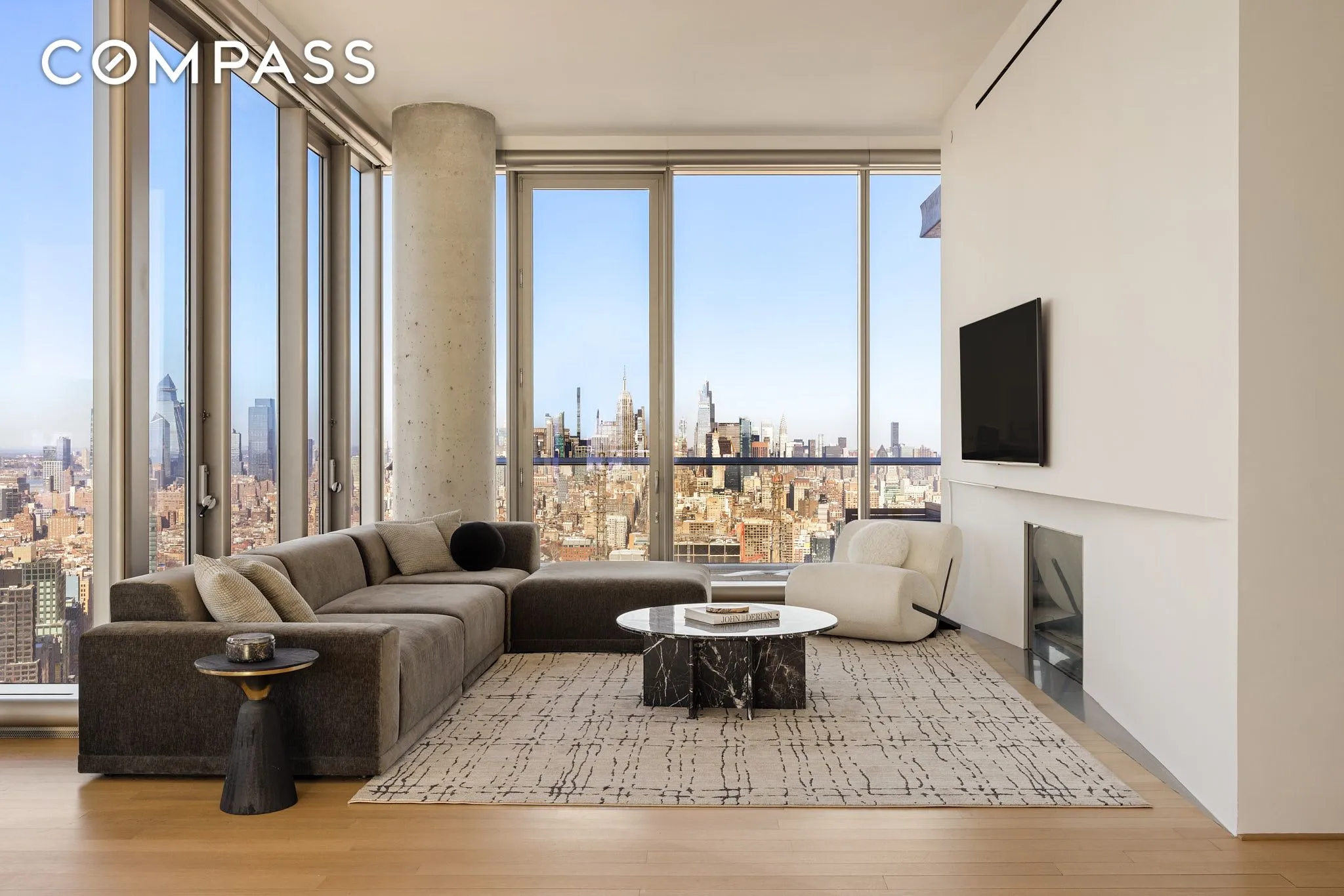 Enter directly from the elevator to your private landing. Immediately, the foyer opens to the great room, where exposures to the north, south and west offer all-day light, impressive views, and a rare grandiosity. This open space is keenly apportioned for multiple seating areas, formal dining, and quiet nooks. To the north you’ll find the first of three terraces plus a fireplace. Gaze north toward the Empire State Building, or even east toward the East River; the scale of the city becomes clear from this vantage.