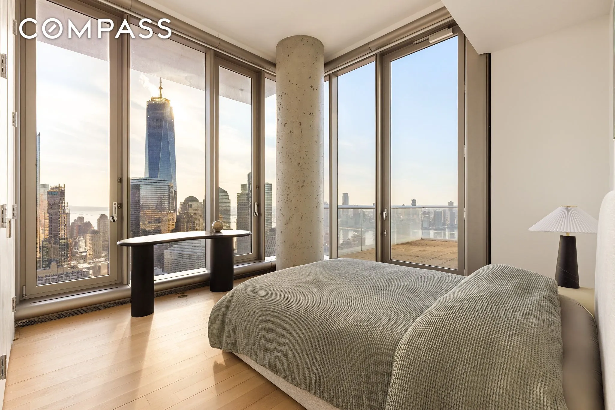 At the south end of the room, find the eat-in kitchen and the second terrace — a large, L-shaped space with access from both the great room and the secondary bedroom. Here, there is plenty of room for outdoor lounging or dining, marveling at the Freedom Tower to the immediate south.