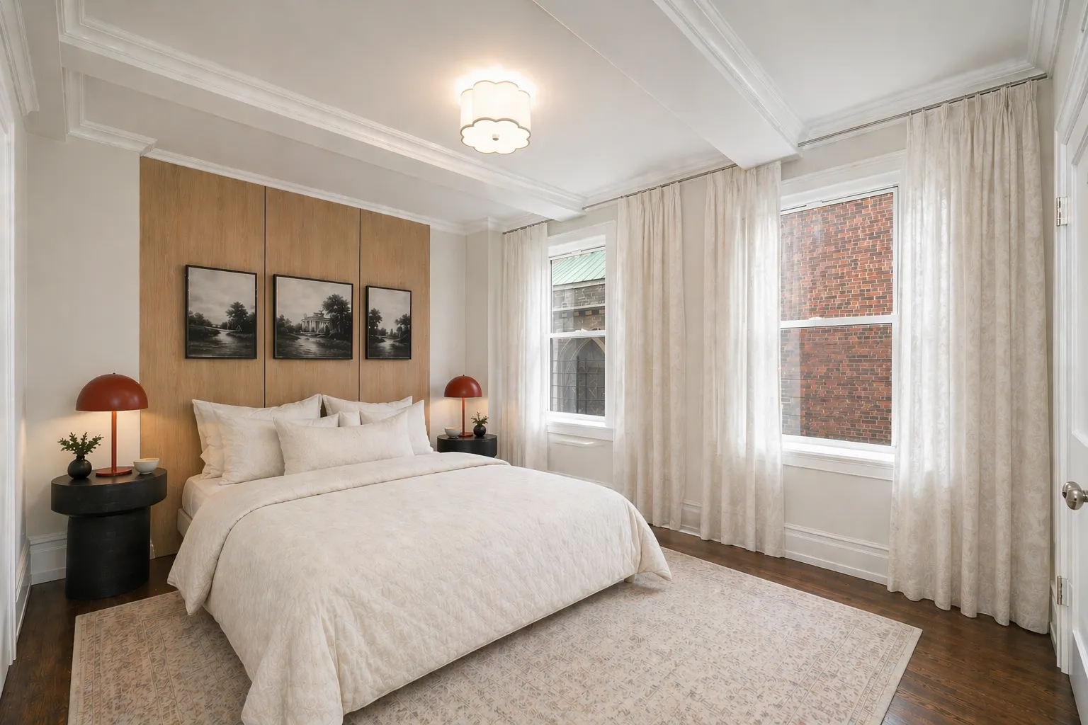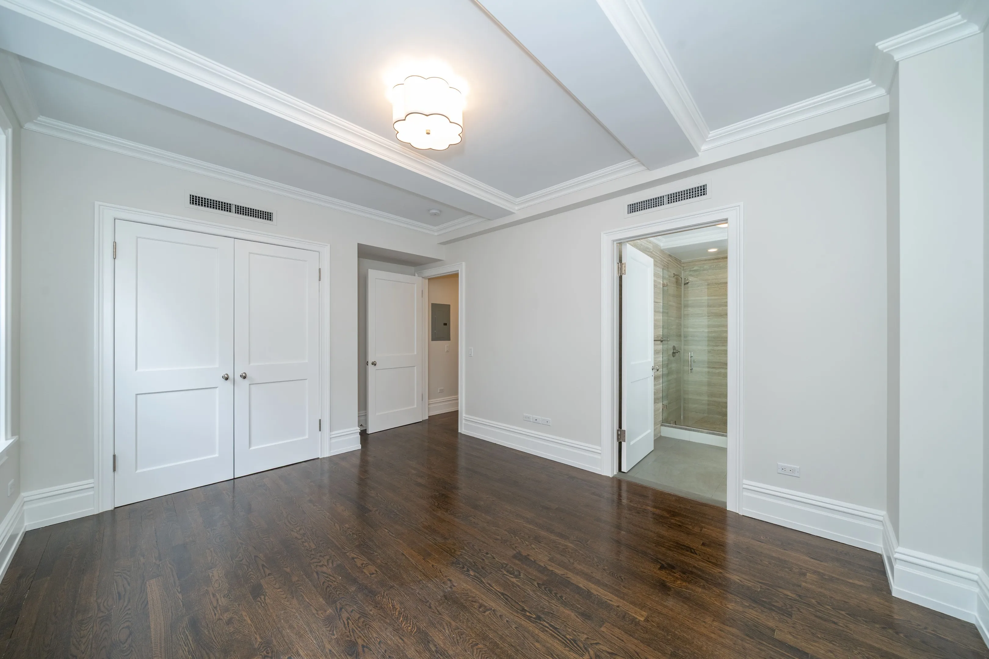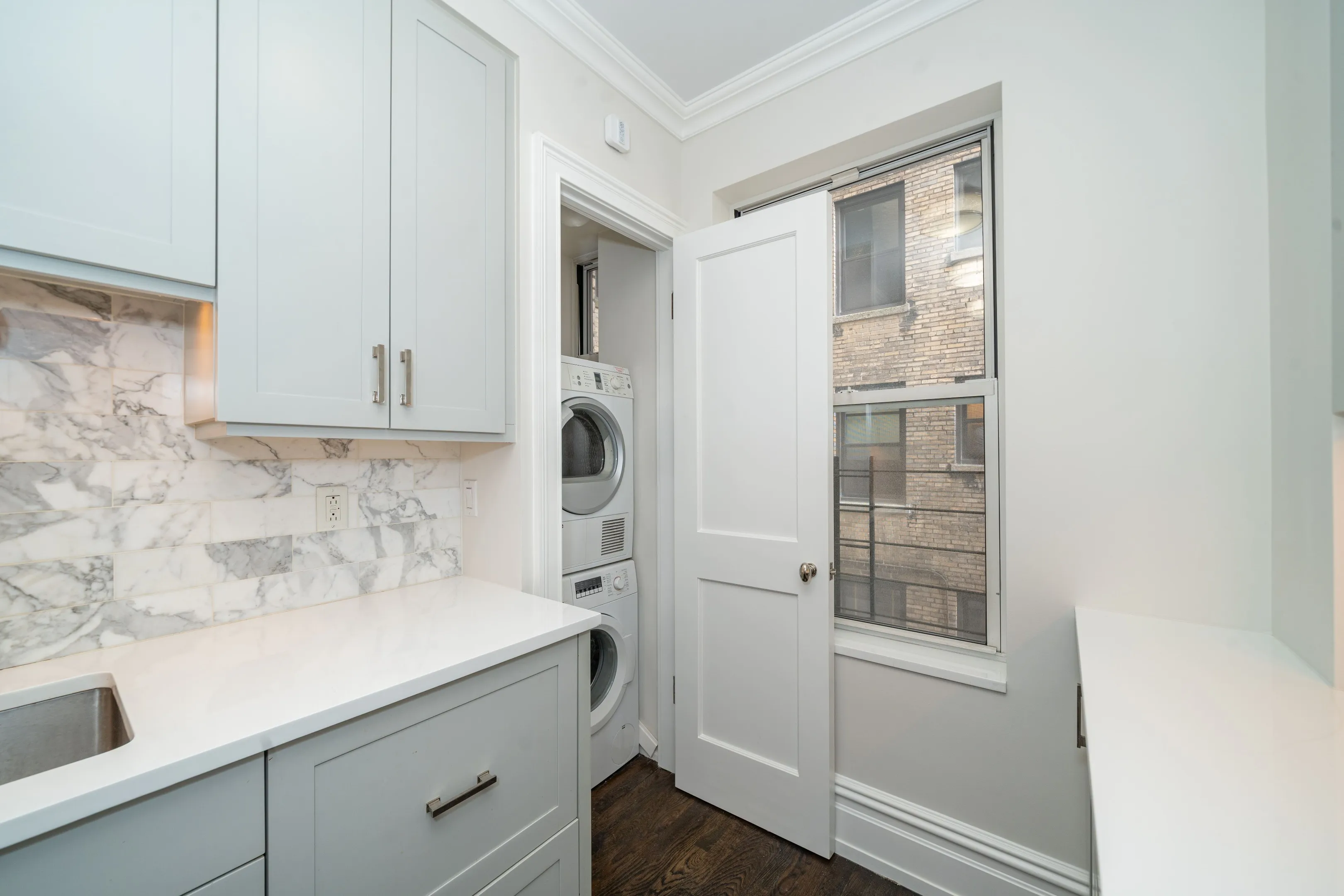 This spacious condo with its east, west, and northern exposures offers a gracious merging of Old World charm and new modernity. High ceilings, crown molding and wide beams are complemented by oak basketweave floors. Relax and entertain in the large main living/dining area with windows on two sides and custom pendant lighting. A sleek showcase kitchen features white stone counters, white cabinetry, and Fischer Paykal, Bosch, Miele, and Bertazonni upscale appliances. Cook to your heart’s delight!