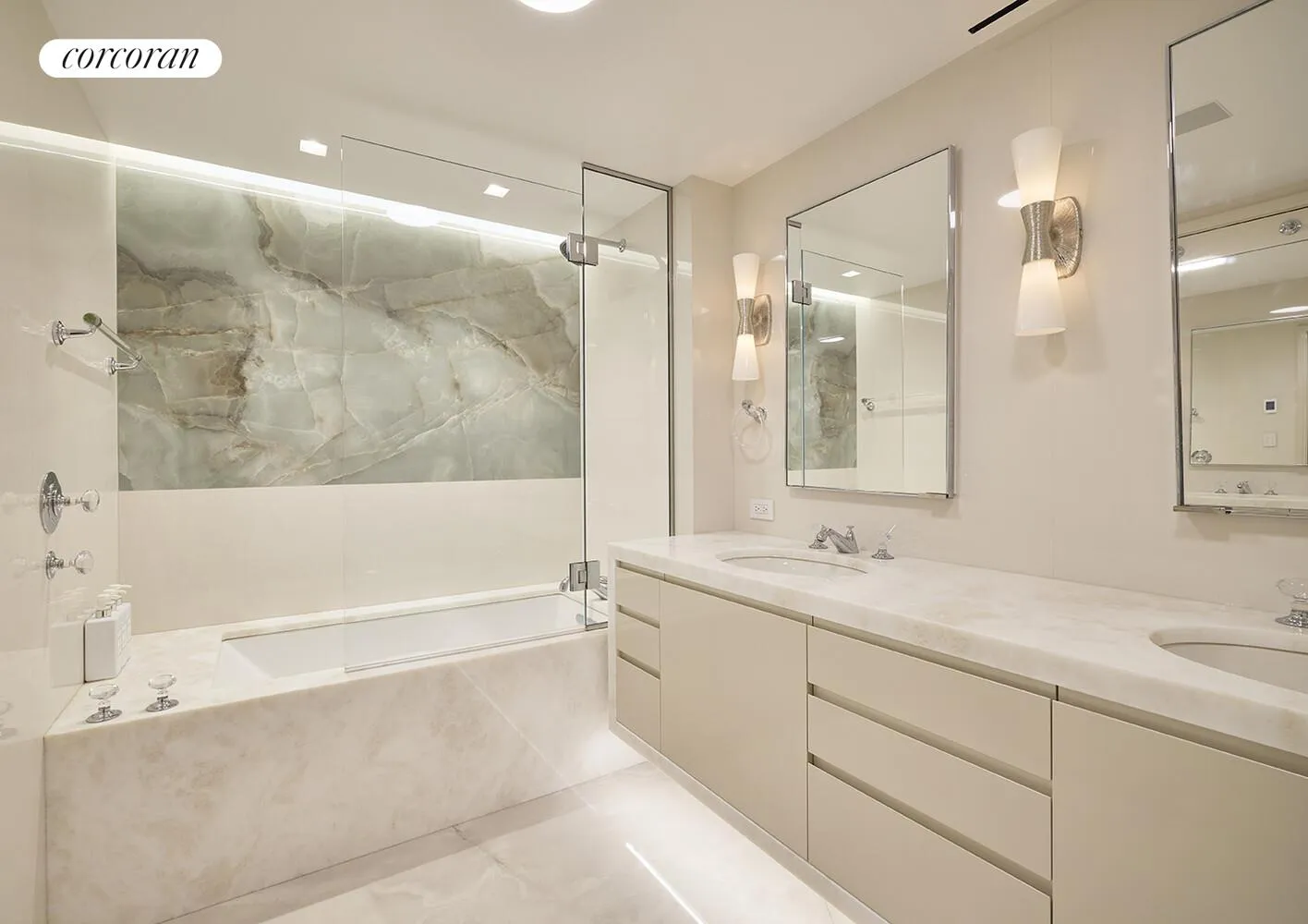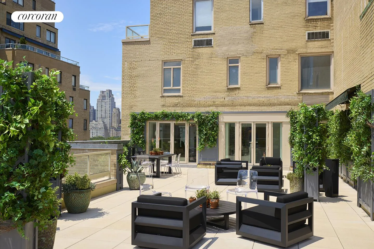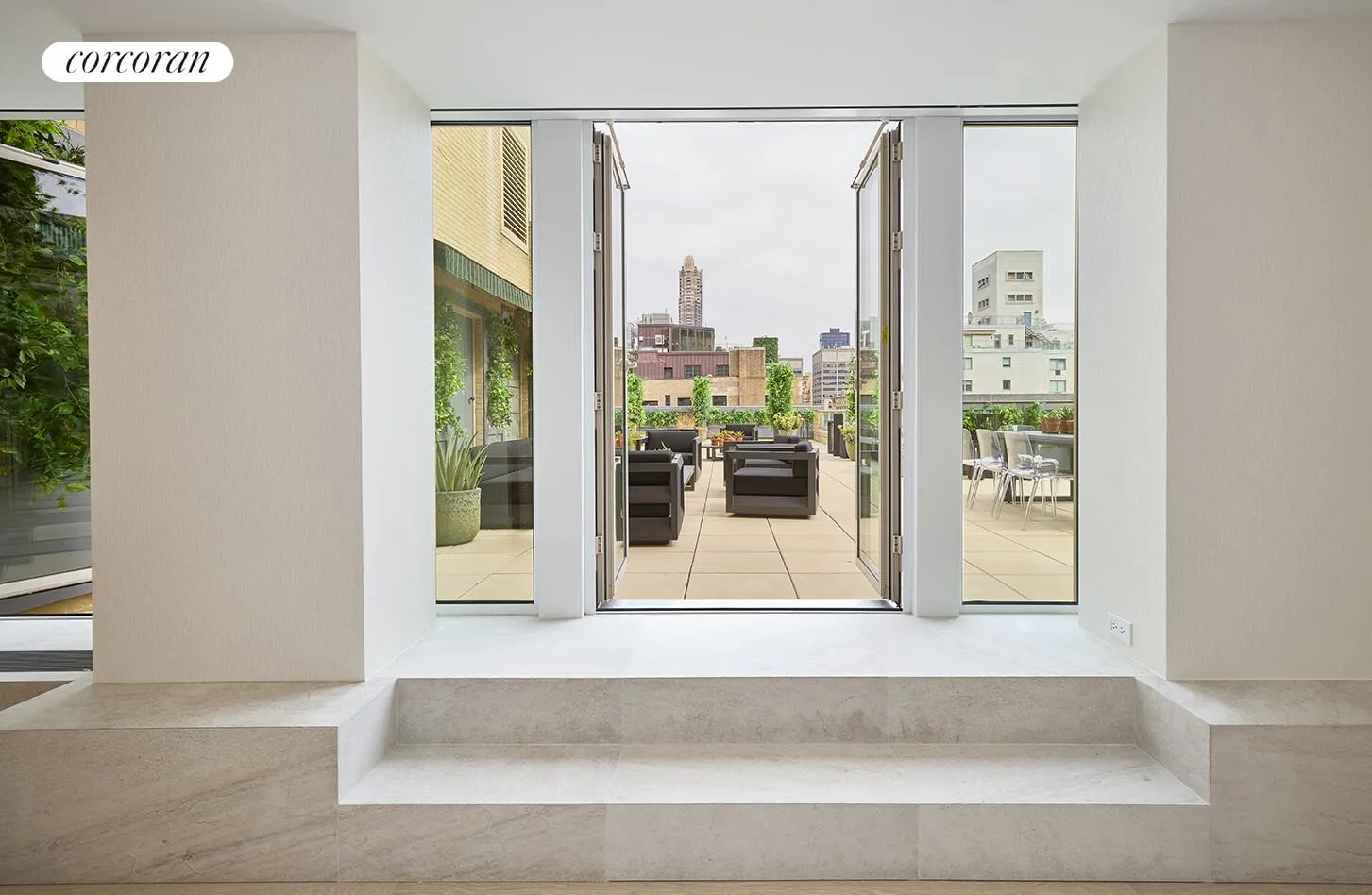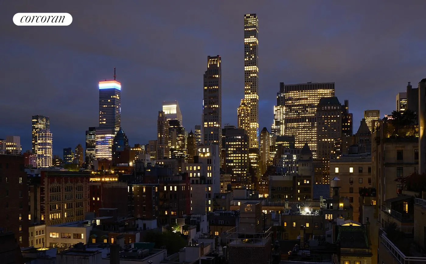 Inside, glamorous style meets thoughtful design. The expansive living and dining areas flow effortlessly across wide-plank white oak floors, illuminated by recessed Element lighting and anchored by a custom backlit onyx bar-a striking centerpiece for entertaining. The open-plan layout extends naturally to the vast terrace through 3 sets of French doors. This a truly rare Fifth Avenue sanctuary with endless possibilities for al fresco dining, lounging, and gatherings under the city skyline.