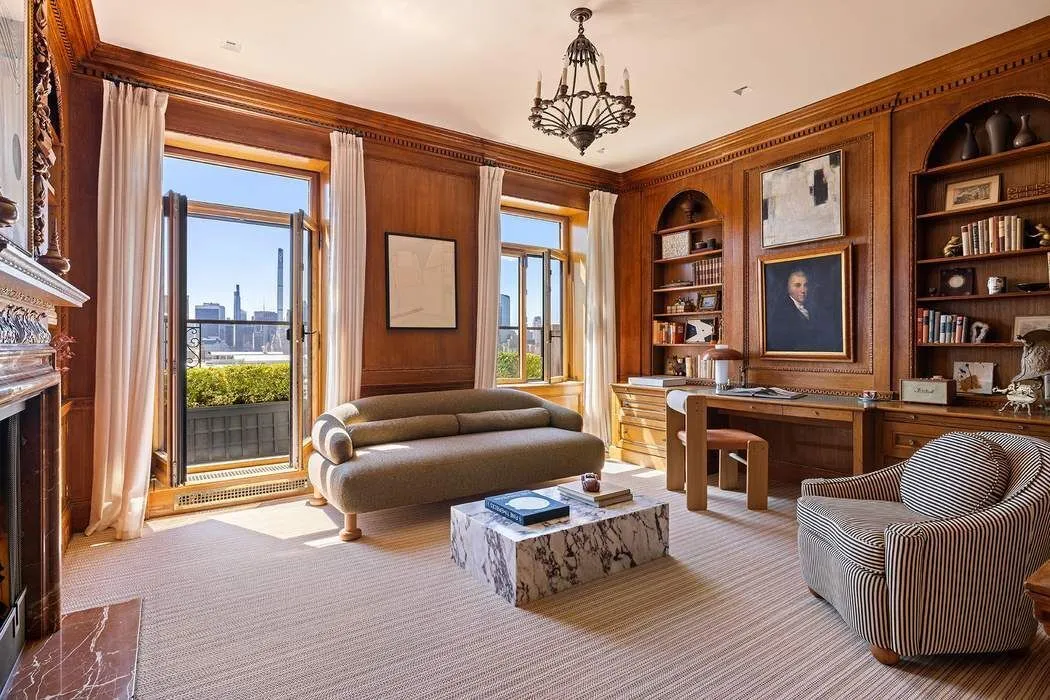 All the principal rooms open onto surrounding terraces, and french doors throughout invite indoor-outdoor living. Rare glass terrace parapets allow the apartment’s sweeping views of the Park to be felt in every room. Accessed via a private elevator landing, the grand Gallery opens to three spectacular entertainment rooms: a marvelous west-facing Living Room, nearly 30 feet in length, with three sets of tall French casement doors opening to the Terrace; an exquisite south-facing wood-paneled Library; and a handsome south-facing Dining Room. The Living Room and Library have wood-burning fireplaces, and all three rooms are perfect in proportion and scale. Nearby, ample closets and an elegant Powder Room complete the grand and welcoming sweep of the entertainment rooms.