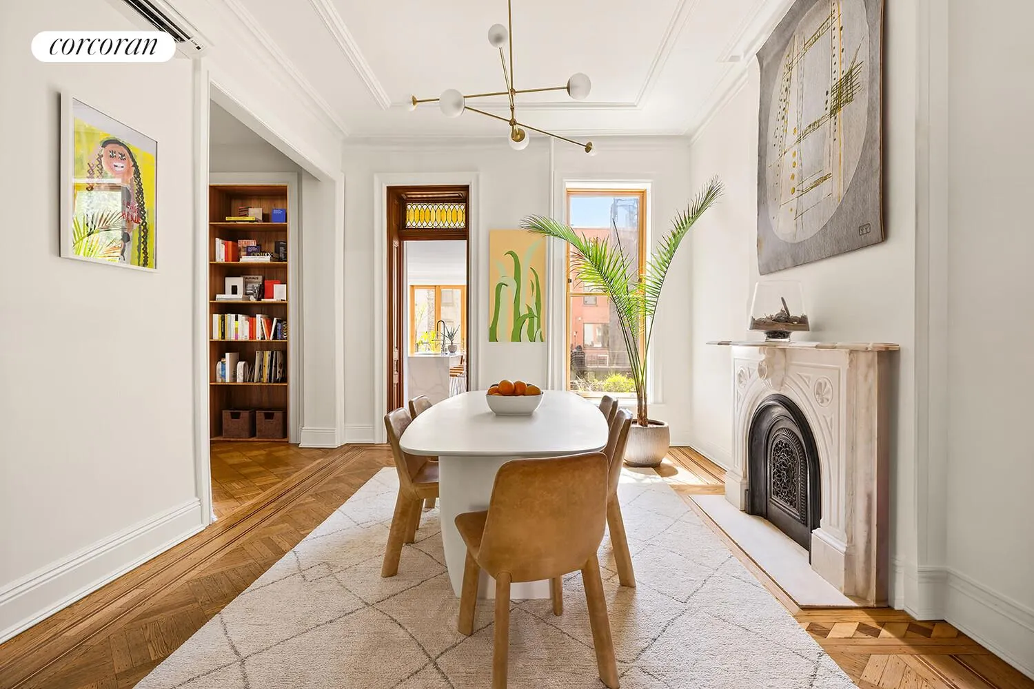 The home’s elegance begins in the front parlor, where soaring ceilings, oversized windows, parquet floors, and a striking wood-burning fireplace create an inviting first impression. The layout flows effortlessly into the rear parlor, featuring a spacious dining area, a home office or work nook, and a dream kitchen designed for both style and function.
