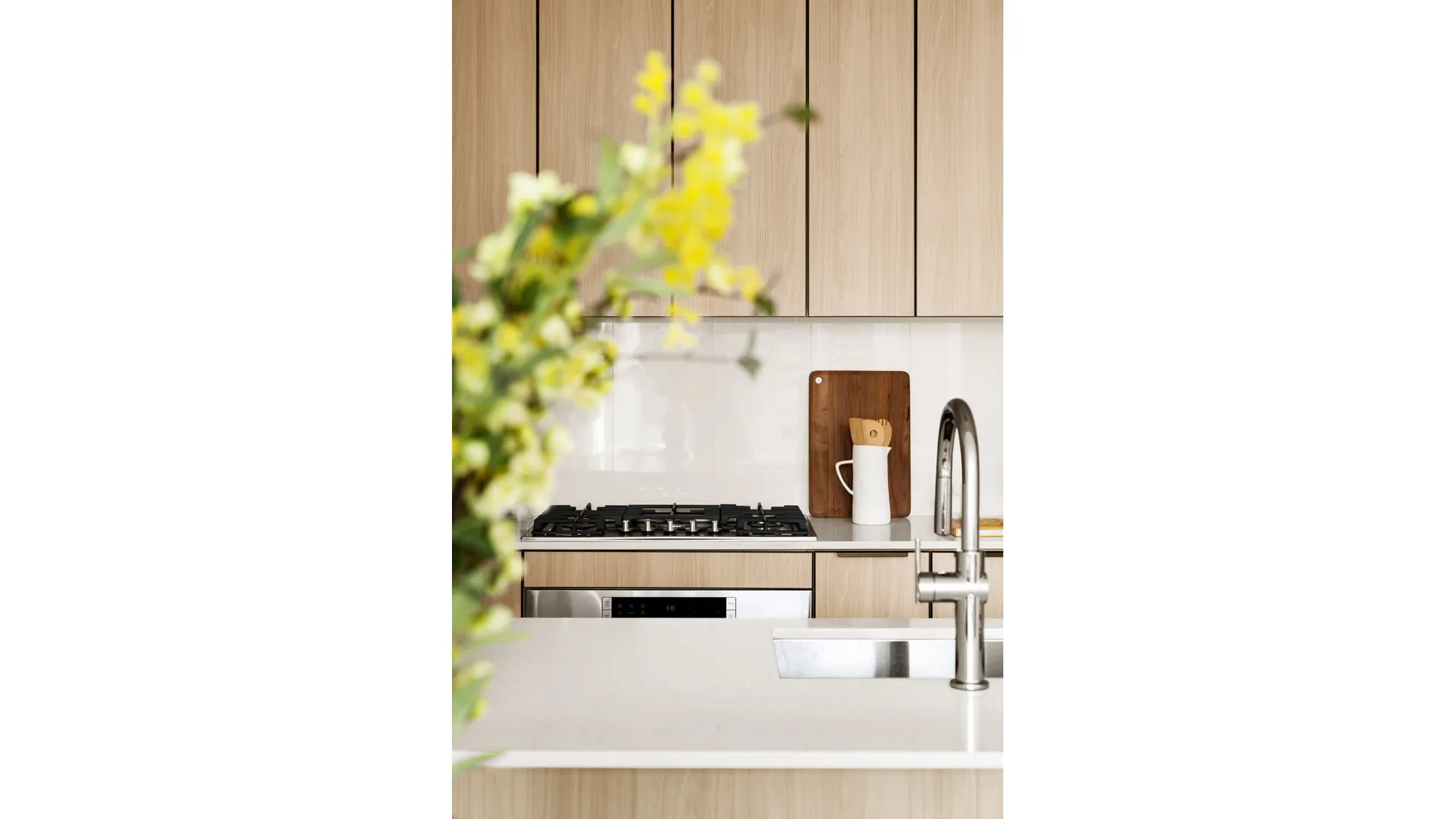 Thoughtful kitchens are adorned with Caesarstone countertops and backsplashes, white oak cabinets, and Bosch appliances. Spa-inspired bathrooms feature oversized Italian-inspired stone-style tiles and oak vanities with white Caesarstone sink tops.