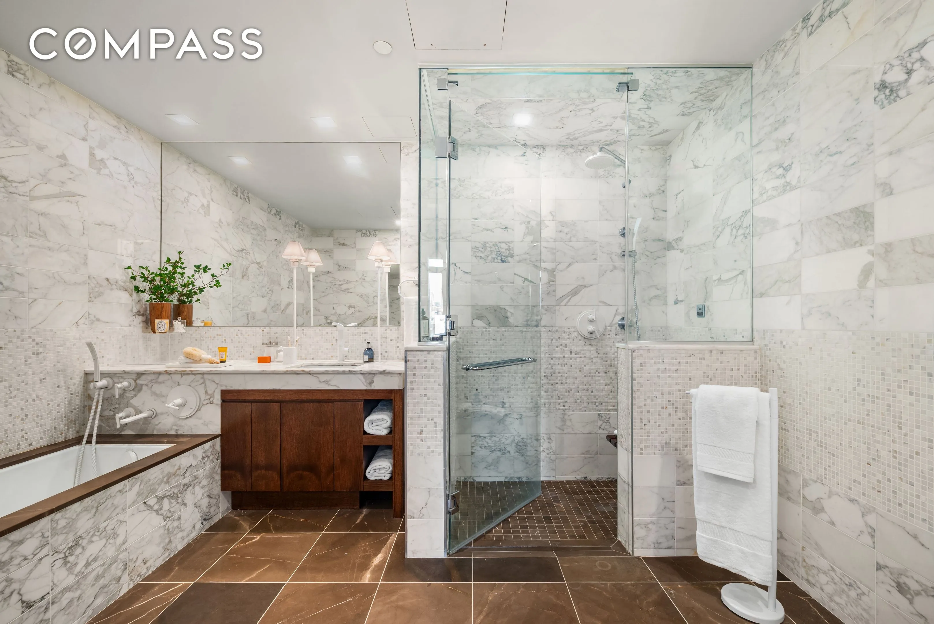 The corner primary suite offers dual exposures with open northern and eastern views, along with a custom-designed Ornare closet featuring bespoke detailing. The spa-like en-suite bath is finished in marble and includes radiant heated floors, a deep soaking tub, and a glass-enclosed steam shower.