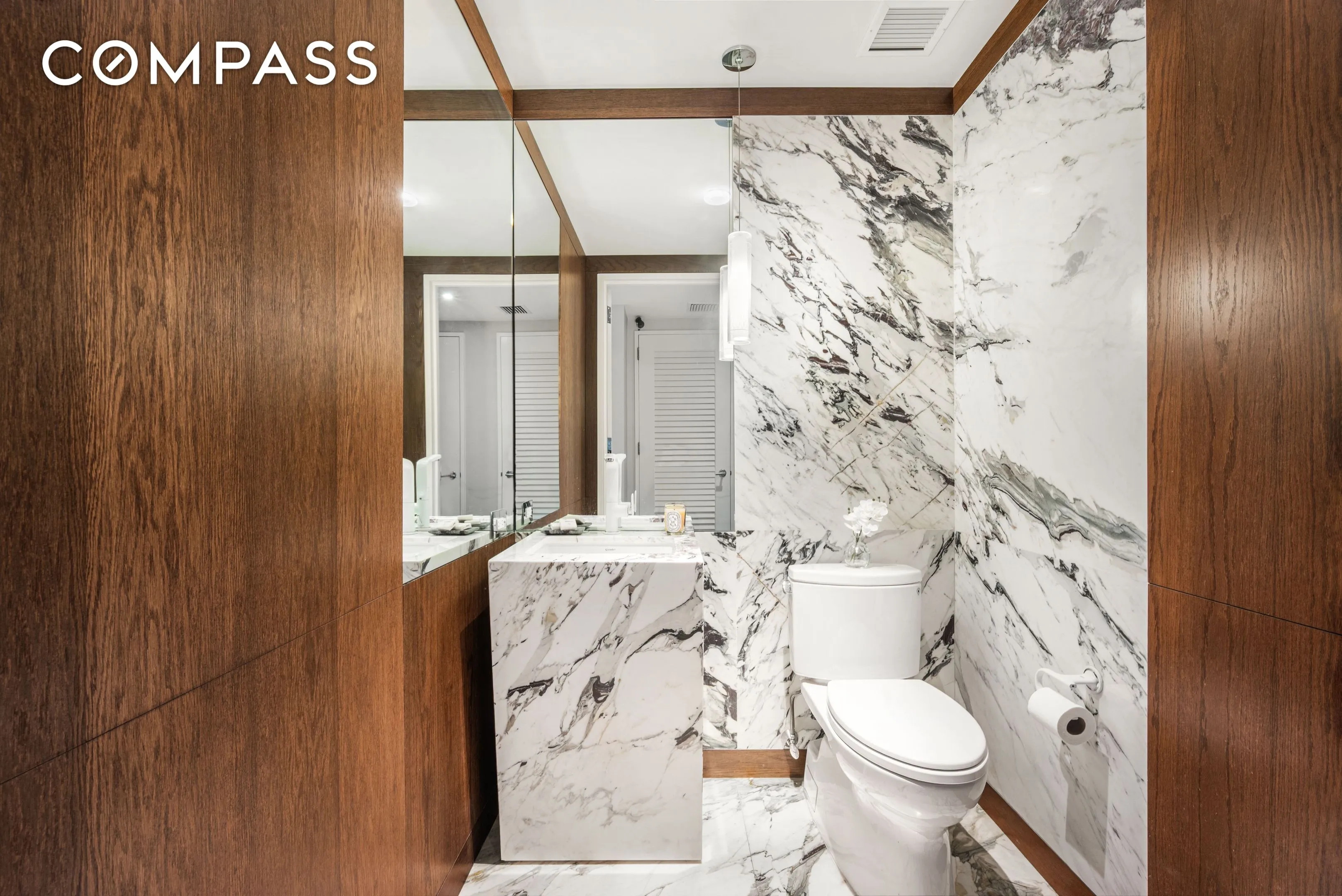 A stylish powder room, located just off the foyer, is beautifully appointed with marble sink accents—an uncommon and highly desirable feature for this layout.