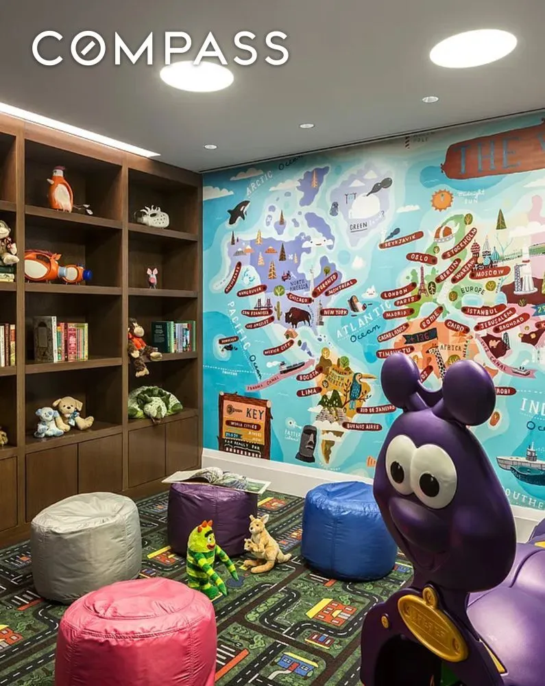 Residents enjoy full-service living with a 24-hour attended lobby and live-in superintendent, along with premium amenities including a fitness center, landscaped terrace, children’s playroom, lounge with dining room, and a temperature-controlled wine cellar with private storage.