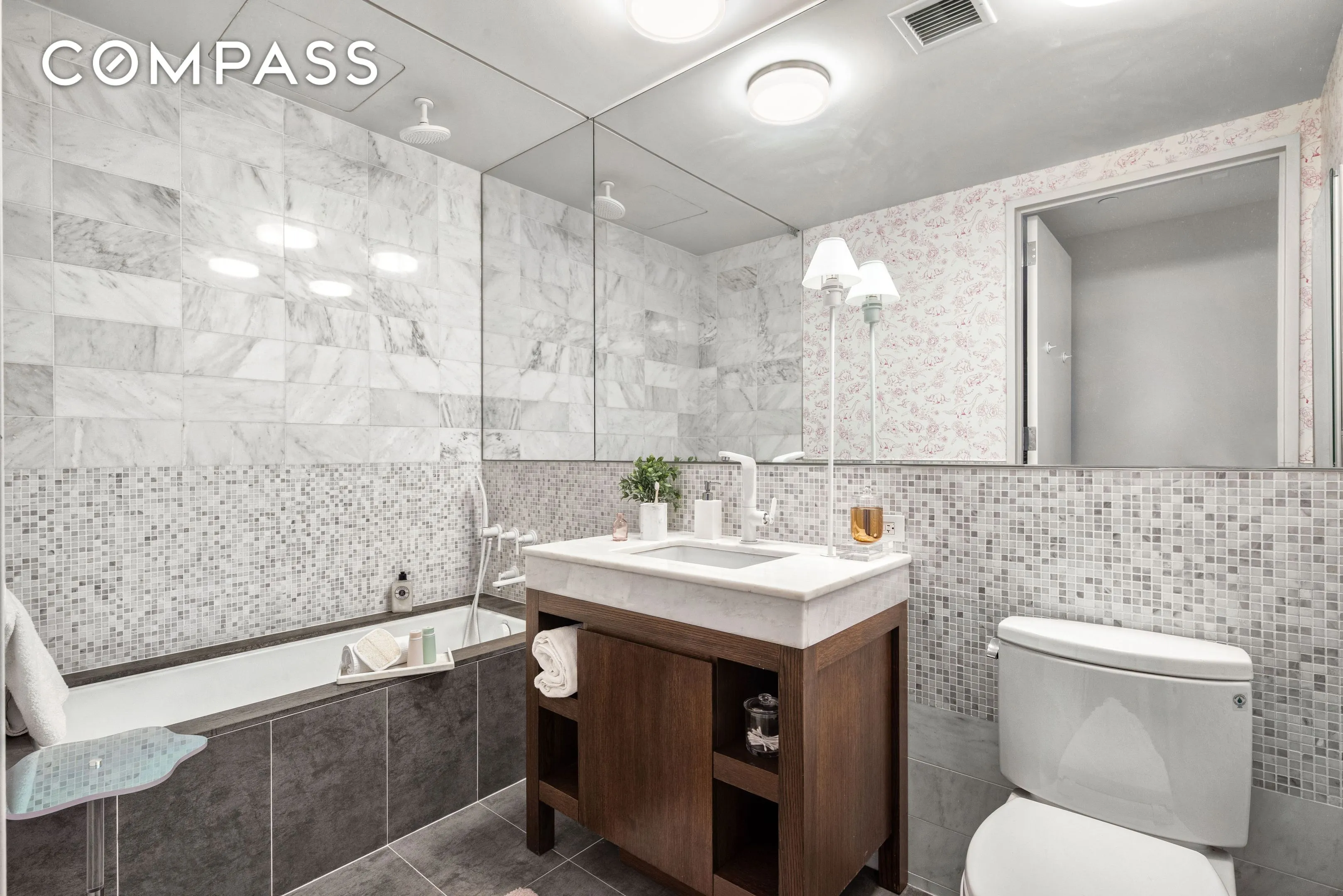 The second bedroom is generously sized, filled with natural light, and features its own en-suite bath complete with refined finishes and a large soaking tub.
