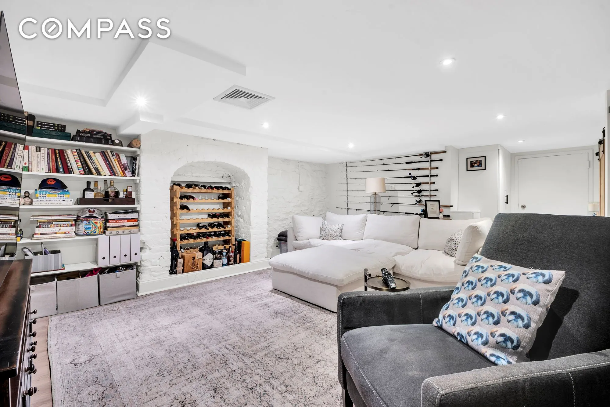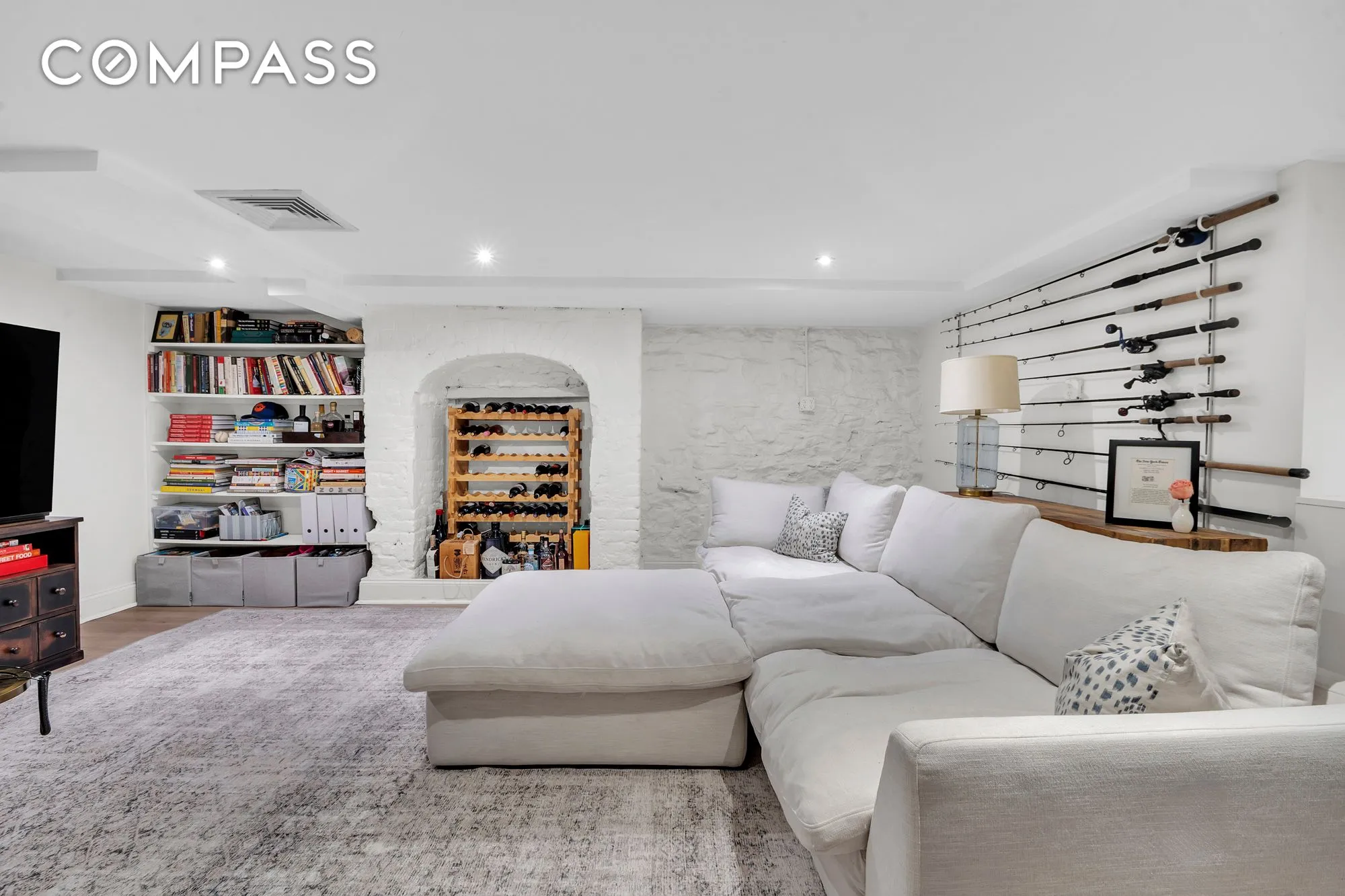 The lower level offers a versatile extension of the home, currently configured as a comfortable family room with custom built-ins and a half bath—ideal for media, work, or guests.