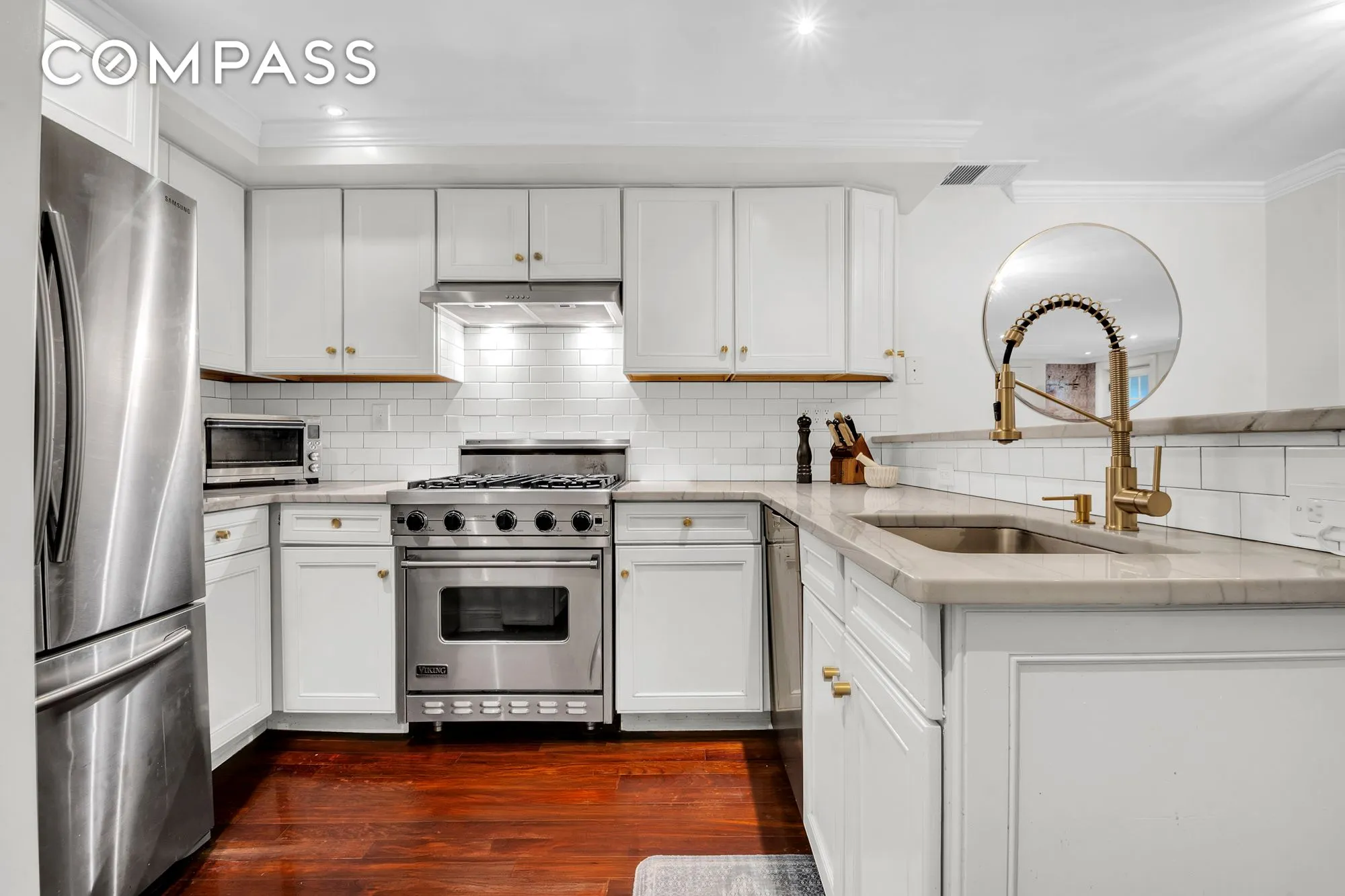 A private entry welcomes you to an expansive living and dining area, where natural light and generous proportions create an inviting space for both everyday living and entertaining. The open kitchen is sleek and functional, featuring Viking stove, brand new Bosch dishwasher, quartzite countertops, and custom cabinetry.