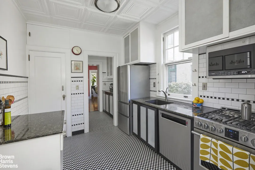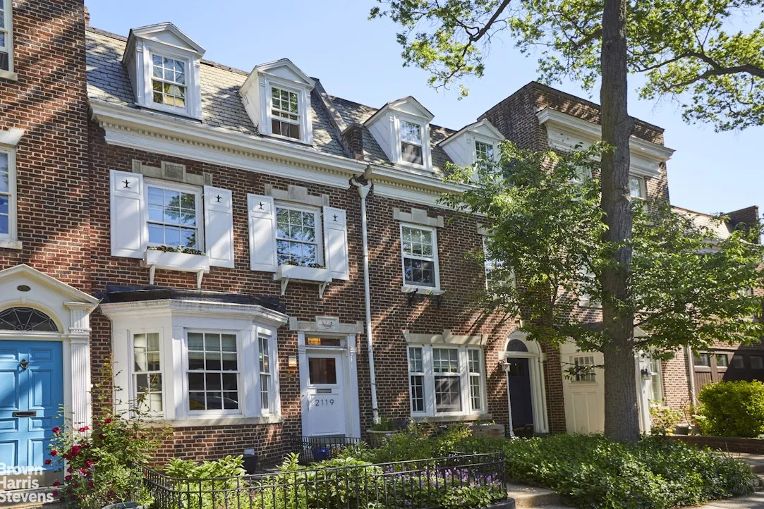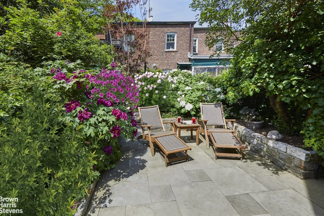 The parlor level is open, bright, and beautifully connected to its front and rear gardens. The living room centers on a large working fireplace and triple bay windows overlooking the deep front garden. French windows in the dining room frame the private back garden and draw light through the full depth of the floor. The renovated kitchen is finished with stone countertops, stainless steel appliances, and a windowed butler’s pantry. From the kitchen, the original Dutch door opens onto the rear garden, where a bluestone patio is bordered by viburnum, climbing hydrangea, and Japanese tree peonies. A sweet rear walkway connects the gardens on this row with the one behind it, fostering a rare sense of community and quiet found only in this landmark district.