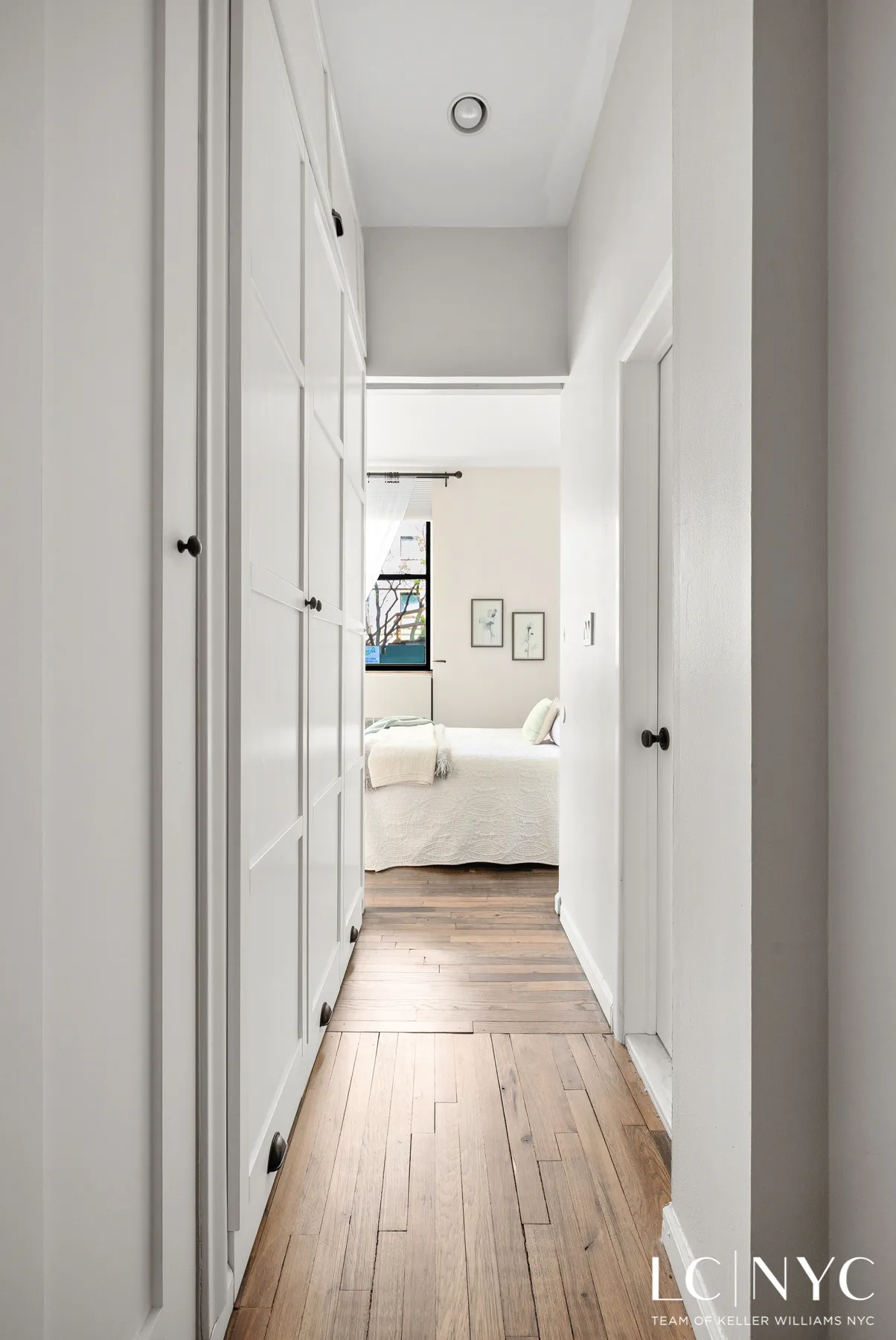 The generously sized primary corner bedroom boasts double exposure, oversized windows, and thoughtfully designed custom built-ins offering both comfort and ample storage. Additional storage abounds with entry closets and a full wall of closets leading to the bedroom. The beautifully renovated bathroom showcases marble finishes and a soaking tub, creating a refined, spa-like retreat.