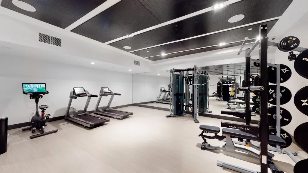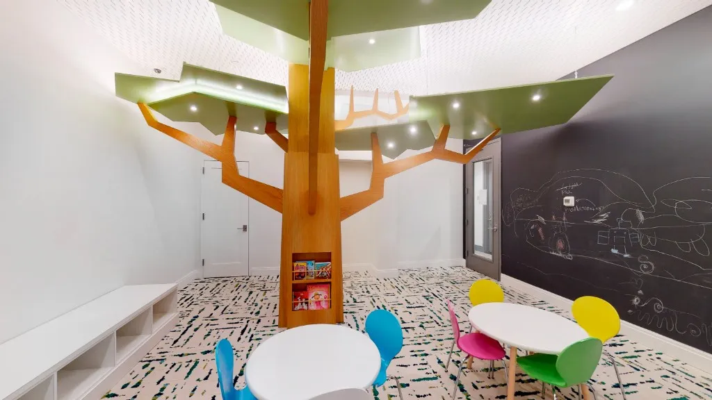 Indoor amenities include a fully equipped fitness center with yoga studio, a childrens playroom, music room, resident lounge with workspaces and kitchenette, and a game room with billiardscreating a well-rounded lifestyle within your own building.