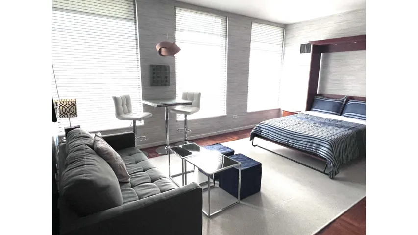 Residence 5B is a spacious studio with approximately 13 foot lofted ceilings, offering the volume and character rarely found in downtown rentals. Original late 19th century factory details remain intact, including exposed brick and a cast iron vent that create a warm and authentic backdrop to the living space.\n